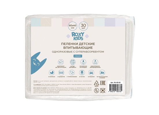 Roxy Kids Пеленки детские впитывающие одноразовые, 60х40 см, 30 шт - 449 руб. купить в Simferopol-Podguznik.ru с доставкой по Крыму