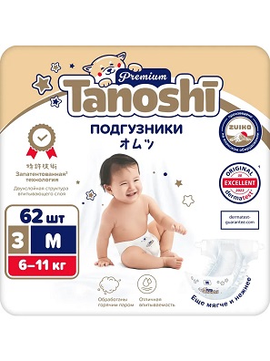 Детские одноразовые подгузники Tanoshi Premium для малышей с весом 6-11 кг (размер 3 / М) еще мягче и нежнее, чем стандартная линейка Tanoshi. Комфортные и безопасные для кожи малыша Таноши Премиум превосходно впитывают по всей длине подгузника, не протекают, не оставляют следов на коже и не ограничивают движений малыша. Произведённые из невероятно нежного и эластичного нетканого волокна на японском оборудовании Zuiko подгузники премиальной линейки Tanoshi стали ещё более мягкими, дышащими и удобными. Для улучшения гигиенических свойств вся продукция Tanoshi Premium обрабатывается горячим паром. Благодаря запатентованной двухслойной структуре впитывающего слоя Таноши Премиум подгузники мгновенно впитывают большое количество жидкости и надежно удерживают её внутри, не создавая комка между ножек. Безклеевое крепление резиночек увеличивает их эластичность и воздухопроницаемость подгузника. Невероятно деликатный и приятный на ощупь 3D волнистый внутренний слой минимизирует контакт кожи с поверхностью подгузника и предотвращает растекание жидкого стула. Микроскопические отверстия во внешнем слое подгузника обеспечивают выведение прелого воздуха, оставляя при этом влагу внутри впитывающего слоя. Кожа малыша надёжно защищена от опрелостей, раздражения и «парникового эффекта» без присыпок и детского крема под подгузник. Двойные мягкие оборочки вокруг ножек малыша и эластичная резиночка на спинке хорошо прилегают к телу ребёнка и защищают от протеканий. Округлые многоразовые липучки не царапают кожу, а цветной индикатор наполнения подскажет, когда подгузник пора сменить на новый. Одинаково хорошо подходят для мальчиков и для девочек. Гипоаллергенны, не содержат отдушек и пропиток. Tanoshi созданы экспертами отрасли с многолетним опытом и сочетают в себе все самые лучшие разработки последних лет в изготовлении детских подгузников. Tanoshi Premium прошли проверку на дерматологическую безопасность (DermaTest, Германия) с отметкой «отлично».